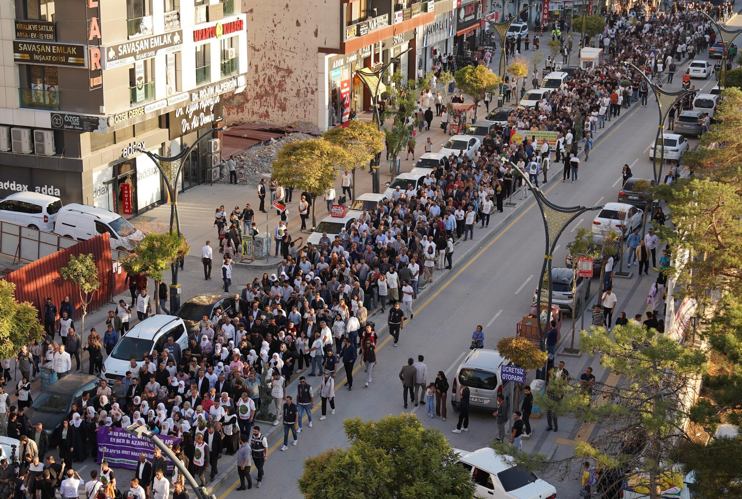 Barış annelerinin öncülüğünde gerçekleşen yürüyüşte “Ji bo mafê hêviyê yê Rêber Apo em ber bi azadîye ve dimeşin!” yazılı pankart açıldı. Kitle, sık sık “Bijî Serok Apo”, “Bê Serok jiyan nabe” ve “Bê Serok aşitî rê ve naçe” sloganları attı.