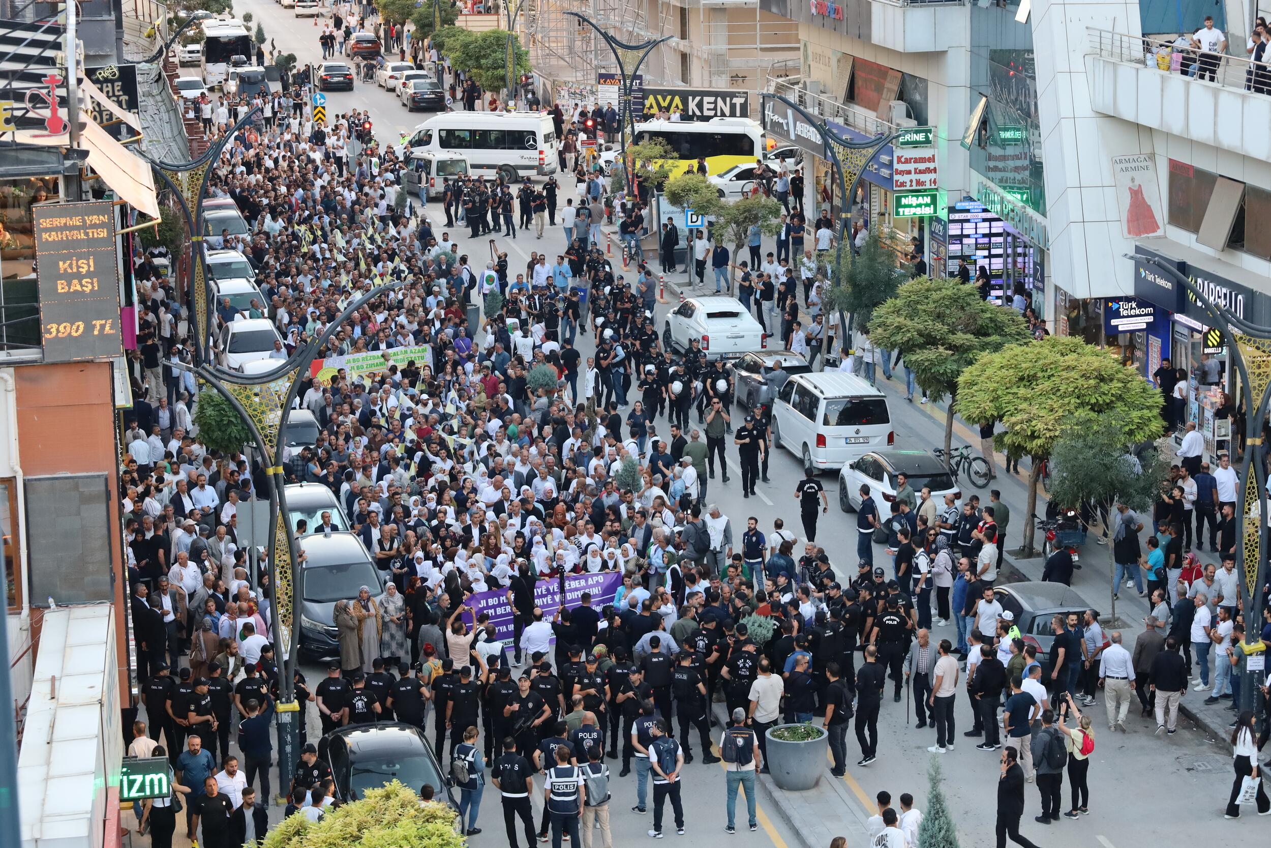Wan’da binlerin katıldığı yürüyüşe sokaktan geçen yurttaşlar da alkışlar, zafer işaretleri ve kornalarla destek verdi. Yürüyüşte Kürt Halk Önderi Abdullah Öcalan’ın pankart ve posterinin açılmasını bahane eden polisler kitleye saldırdı.