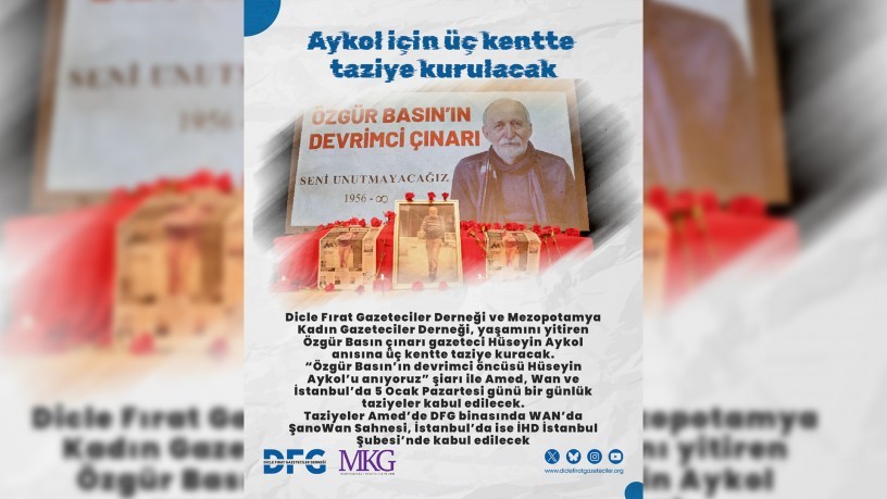 Dicle Fırat Gazeteciler Derneği (DFG) ve Mezopotamya Kadın Gazeteciler Derneği (MKG), “Özgür Basın’ın devrimci öncüsü Hüseyin Aykol’u anıyoruz” şiarı ile Amed, Wan ve İstanbul’da 5 Ocak Pazartesi günü bir günlük taziye kuracak.