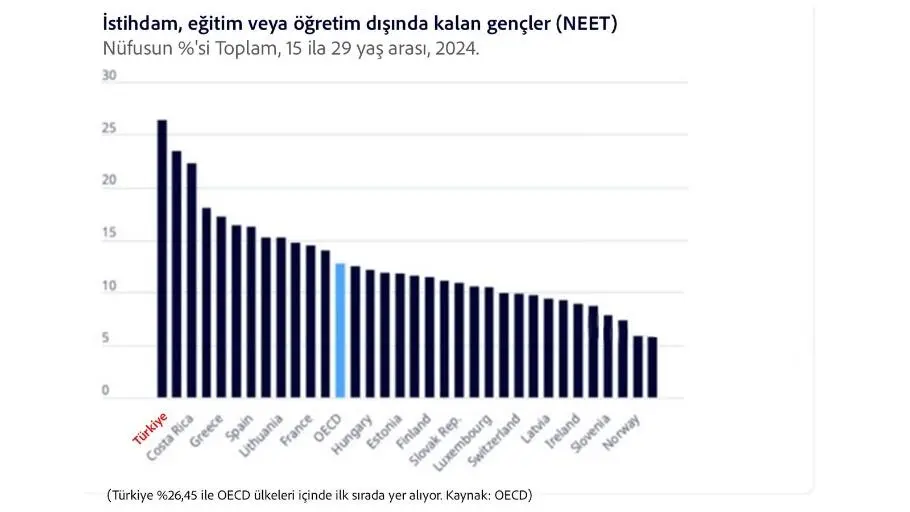 Türkiye ne istihdamda ne de eğitimde olanlar açısından, yüzde 26,6’lık bir oran ile OECD ülkeleri arasında ilk sırada yer alıyor. Yani 15-29 yaş arasında, bir işi olmayan ama eğitimde de olmayan genç oranı toplam gençlerin dörtte birinden fazla.