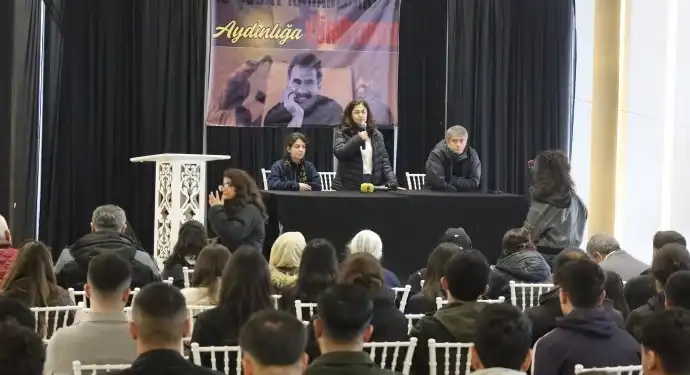 Riha’nın Haliliye ilçesinde bulunan bir düğün salonunda düzenlenen buluşmada, Kürt Halk Önderi Abdullah Öcalan’ın resminin bulunduğu pankartlar ve “Komplo vala derket, Serok Apo bi serket”, “Önder Apo’ya özgürlük, Rojava’ya statü” ve “Örgütlü gençliği hiç bir güç yenemez, yoldaşlıkla, iradeyle binlerce örgüyle” pankartları açıldı.