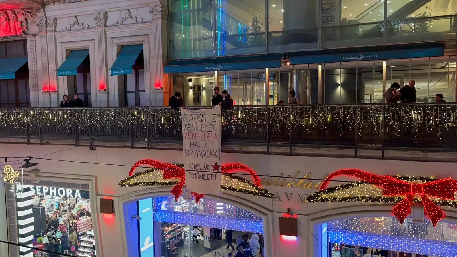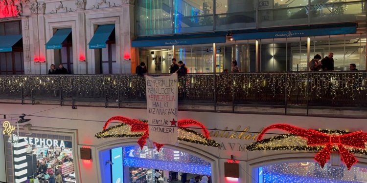 Gençlik Komünleri, Amerika Birleşik Devletleri’nin (ABD) Venezuela’ya yönelik müdahalesini protesto etti. Gençler, İstanbul Beyoğlu’nda bulunan İstiklal Alışveriş Merkezi’ne (AVM) pankart asarak protesto eylemi gerçekleştirdi. Eylemde, “Emperyalizm yenilecek Venezuela’da halkı kazanacak” pankartı asıldı.