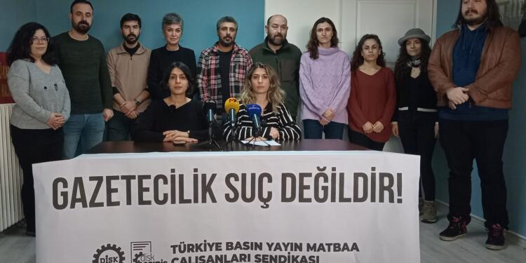 Türkiye Devrimci İşçi Sendikaları Konfederasyonu’na (DİSK) bağlı Türkiye Basın, Yayın, Gazetecilik, Grafik-Tasarım, Baskı ve Ambalaj Sanayi İşçileri Sendikası (Basın-İş), İzmir’de 13 Şubat’ta yapılan ev baskınlarında Mezopotamya Ajansı (MA) muhabirleri Semra Turan, Delal Akyüz ve Tolga Güney, JINNEWS muhabiri Melike Aydın, Gazete Duvar muhabiri Cihan Başakçıoğlu ile Halkların Eşitlik ve Demokrasi Partisi (DEM Parti) basın çalışanı Fatma Funda Akbulut’un gözaltına alınmasına ilişkin Beyoğlu’nda bulunan sendika binalarında basın toplantısı gerçekleştirdi.