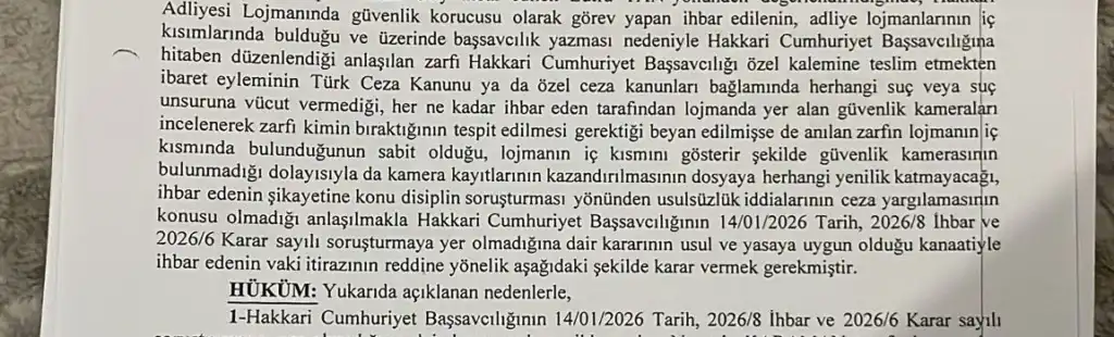 Başvuruyu inceleyen Hakkâri Cumhuriyet Başsavcılığı 14 Ocak’ta mektubu bulan ve işleme alan personellerin görevlerinin gereğini yerine getirdiğini belirtirken, kamera kayıtları için ise; “Mektubun lojmanların iç tarafına bırakıldığı yerde kameralar bulunmuyor” diyerek dosyada “Soruşturmaya yer olmadığı” kararı verdi.