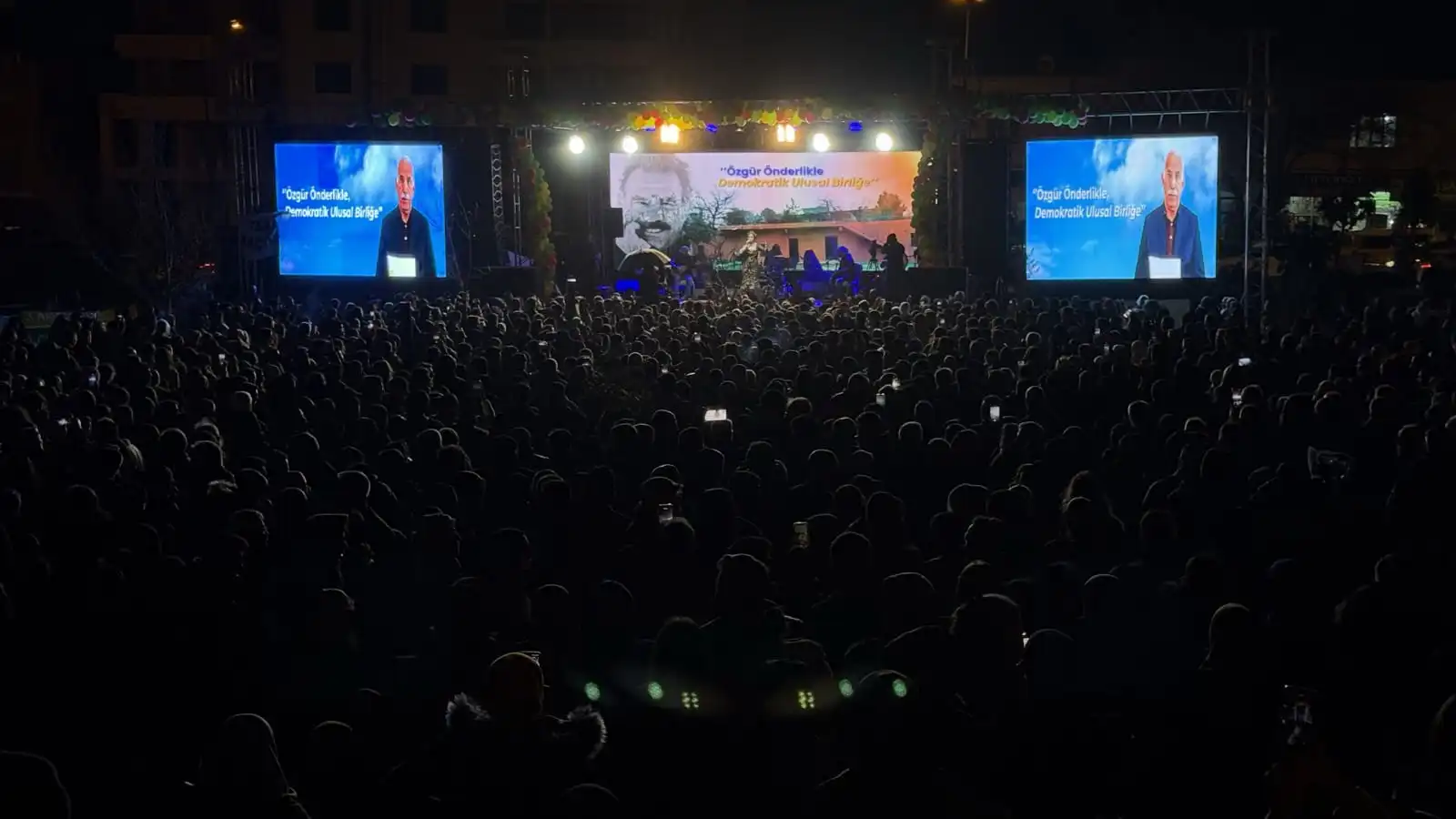 Yöresel kıyafetler ve sarı, kırmızı, yeşil renklerle alanı dolduran binler, “Bijî Serok Apo”, “Rojbûna te pîroz be ey Serok Apo” sloganları attı.