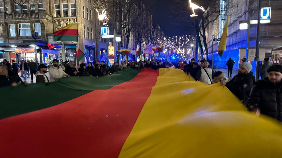 Hamburg MediaMarkt önünde yapılan basın açıklamasının ardından kitle, Hamburg Rathaus’a doğru yürüyüşe geçti. Katılımcılar sık sık “Rojava, Rojhilat’e Kürdistan Yek Welat’e”, “Bijî Berxwedana Rojava”, “Bijî Serik Apo” ve “Bijî Berxwedana Şêxmeqsûd ü Eşrefiyê” sloganları attı.