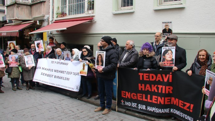 İnsan Hakları Derneği (İHD) İstanbul Şubesi Hapishaneler Komisyonu “F Oturması” eyleminin 727’ncisi Beyoğlu’nda bulunan dernek binası önünde gerçekleştirdi. Çok sayıda hak savunucularının katıldığı basın açıklamasında, Marmara 5 No’lu L Tipi Kapalı Ceza İnfaz Kurumu’nda tutulan 70 yaşındaki ağır hasta tutsak Mehmet Edip Taşar’ın sağlık durumuna dikkat çekildi. Basın metnini İHD üyesi Memik Horuz okudu.