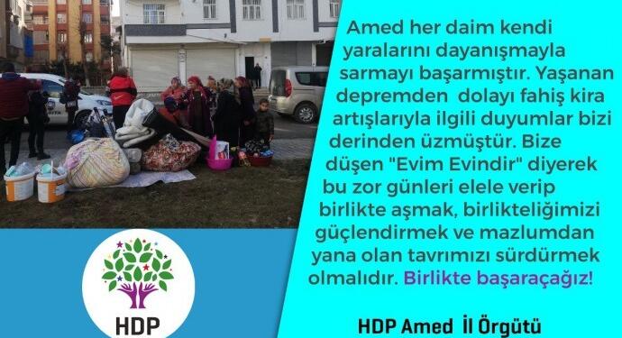 Kampanyaya ilişkin HDP’nin sanal medya hesabı üzerinden yapılan duyuruda şöyle denildi: “Amed, her daim kendi yaralarını dayanışmayla sarmayı başarmıştır. Yaşanan depremden dolayı fahiş kira artışlarıyla ilgili duyumlar bizi derinden üzmüştür. Bize düşen ‘Evim Evindir’ diyerek bu zor günleri el ele verip birlikte aşmak, birlikteliğimizi güçlendirmek ve mazlumdan yana olan tavrımızı sürdürmek olmalıdır. Birlikte başaracağız.”