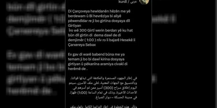 “Güçlerimizin ilgili yetkililerle birlikte sürekli çabaları kapsamında, rehine sorununu çözmek için, son olaylarda yakalanan 300 rehine bugün saat 13.00’te Hesekê’nin Al-Sabah Kavşağı’nda serbest bırakılacak.”
