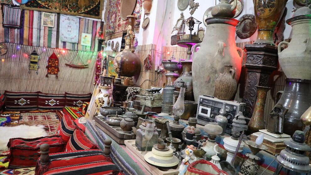 Mihemed Hac Xidir, çocukluk merakını zamanla geniş bir koleksiyona, ardından da bugün bölgenin kültürel hafızasını yansıtan bu özel mekâna dönüştürmüş. Dükkân, savaşın gölgesinde ayakta kalmaya çalışan Suriye’nin çok renkli kültürel mirasının canlı bir parçası gibi. Dışarıdan bakıldığında sıradan bir dükkân gibi görünse de içeri girildiğinde 100 ila 120 yıl öncesinin bir evindeymiş hissi veriyor. Toprak testiler, bakır ibrikler, cezveler, eski sandıklar, el dokuması kilimler, dekoratif kılıçlar, Nefertiti portreli bakır tabaklar ve bölgenin çok renkli kültürel geçmişine dair daha pek çok parça sergileniyor.