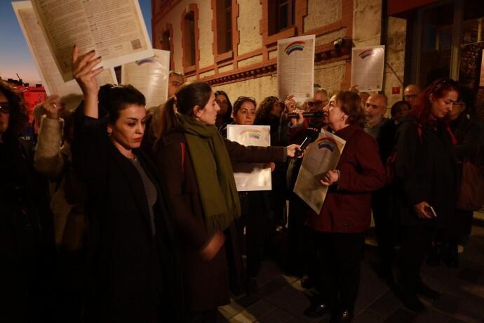 Burada kısa bir konuşma yapan İHD İstanbul Şubesi Başkanı Jiyan Tosun insan hakları haftasında yürüyüşün engellenmesinin hak ihlali olduğunu belirtti. Türkiye İnsan Hakları Vakfı (TİHV) İstanbul Temsilci Ümit Efe de bir hafta boyunca birçok yerde etkinlik gerçekleştirdiklerini söyleyerek, “İşkencenin ve kötü muamelenin olmadığı hapishanesiz bir dünya umuduyla biz bu yürüyüşümüzü gözaltı ve hapishanelerde tutulan başta Hatice Onaran olmak üzere tüm hak savunucularına adıyoruz” diye konuştu.