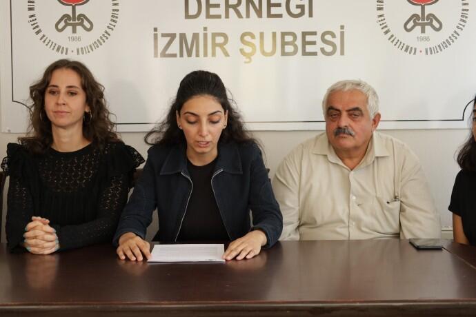 12 Eylül’de gerçekleştirilen ev baskınlarda gözaltına alınan yurttaşlara yönelik yaşanan hak ihlallerine karşı İnsan Hakları Derneği (İHD)İzmir Şubesi Konak’ta bulunan şube binasında açıklama gerçekleştirdi. İHD İzmir Şube Eşbaşkanı Zilan Gümüş, Ezilenlerin Sosyalist Partisi (ESP) İzmir üyelerine yönelik 12 Eylül’de gerçekleştirilen ev baskınlarında en az 18 kişinin gözaltına alındığını belirterek, gözaltı süreleri boyunca darp edildiklerini, kadınlara yönelik cinsiyetçi söylemlerde bulunulduğu, hastanede kelepçe ile muayene gibi birçok hak ihlalinin gerçekleştiğini ifade etti.