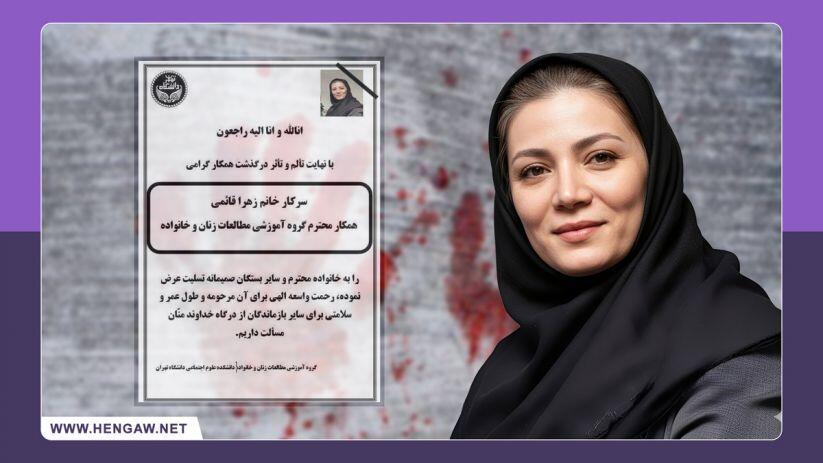 Hengaw İnsan Hakları Örgütü’nün verdiği bilgilere göre, İran’ın başkenti Tahran’da yaşayan ve Tahran Üniversitesi Sosyal Bilimler Fakültesi Kadın ve Aile Çalışmaları Bölümü öğretim üyesi Zahra Ghaemi, evli olduğu erkek tarafından katledildi.