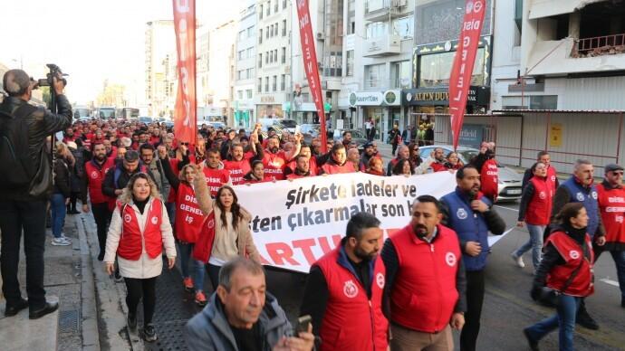 Devrimci İşçi Sendikaları Konfederasyonu (DİSK) Genel Hizmet İşçileri Sendikası’na (Genel-İş) üye İzmir Büyükşehir Belediyesi (İzBB) işçileri, işlerine iade edilmeleri talebiyle başlattıkları eylemin üçüncü gününde Konakpier önünde bir araya gelerek Kültürpak Basmane Kapısı’na doğru yürüdü. Yürüyüşün ardından Kültürpark Basmane Kapısı önünde basın açıklaması gerçekleştirildi.
