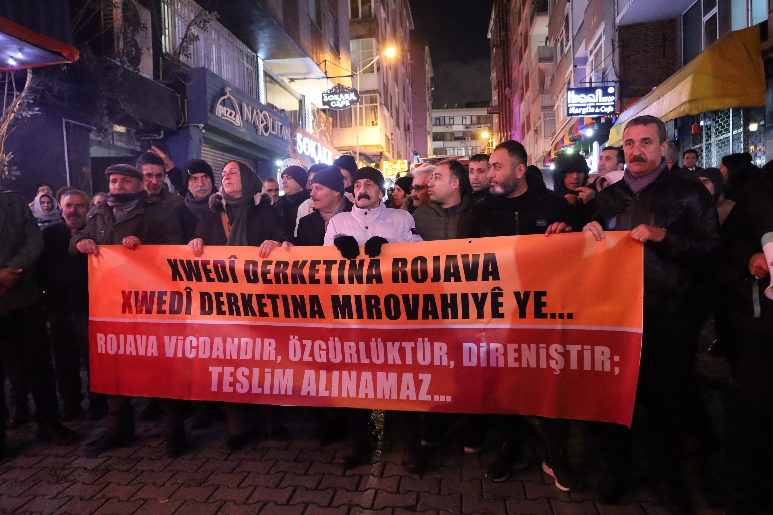 Halkların Eşitlik ve Demokrasi Partisi (DEM) Esenyurt ve Bahçelievler ilçe binası önünde, Kuzey ve Doğu Suriye’ye yönelik saldırıları protesto etmek amacıyla yürüyüş ve basın açıklaması gerçekleştirildi. Polisin müdahalesine rağmen kitle açıklama ve yürüyüş gerçekleştirdi. “Rojava’ya saldırılara dur de! Rojava vicdandır, direniştir, özgürlüktür teslim alınamaz” pankartının açıldığı açıklamaya çok sayıda kişi katıldı. Sık sık “Bijî berxwedana Rojava”, “Rojava faşizme mezar olacak”, “Kurdistan goristan ji bo faşista” sloganları atıldı.