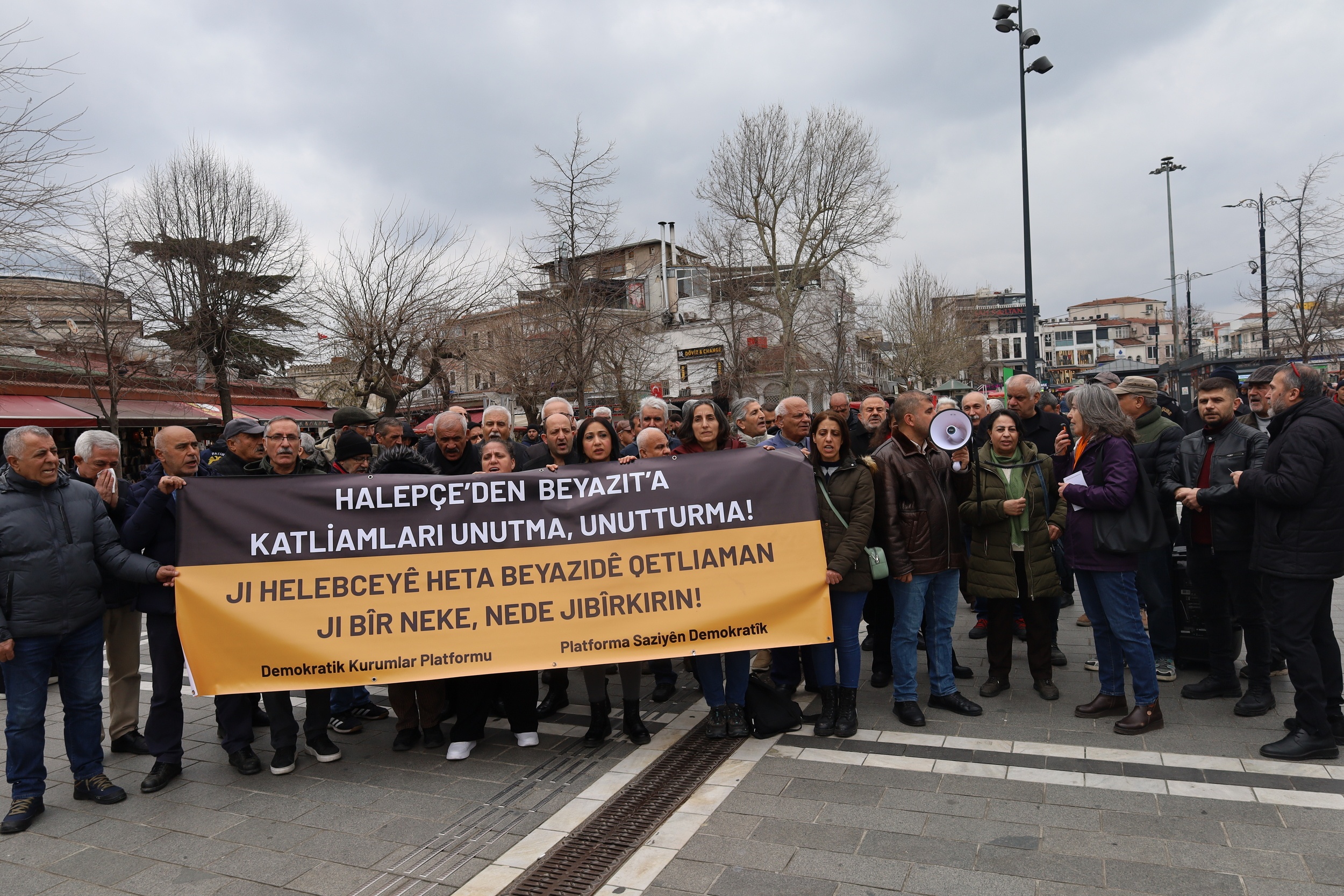 Demokratik Kurumlar Platformu, “Halepçe ve Beyazıt Katliamlarını Unutmadık, Unutturmayacağız” şiarıyla İstanbul Fatih’te Beyazıt Meydanı’nda açıklama yaptı. “Jî Helepceyê Heta Beyazidê Qetliaman Ji Bîr Neke, Nede Jibîrkirin” pankartının açıldığı açıklamada sık sık, “Helepçe Birîna Gelê Kurd e”, “Beyazıt’ı Unutma Unutturma” ve “Helepçe Rûmete, Rumeta Me Ye” sloganları atıldı. Açıklamaya çok sayıda kişi katıldı. Açıklamanın Kürtçesini Demokratik Bölgeler Partisi (DBP) Marmara 3’üncü Bölge Eşsözcüsü Hasan Teymur, Türkçesini de Özgür Kadın Hareketi’nden (Tevgera Jinên Azad- TJA) Rojda Yılmaz yaptı.