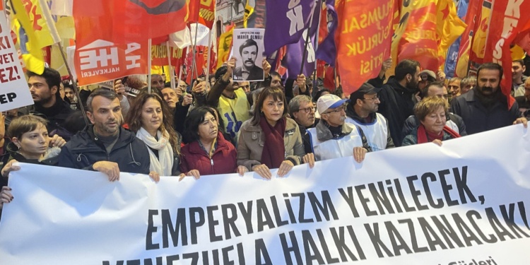 “Emperyalizm yenilecek, Venezuela halkı kazanacak” pankartı açılan eylemde, “Katil ABD Venezuela’dan defol”, “NATO’dan çıkılsın, üsler kapatılsın” ve “Yaşasın halkların ortak mücadelesi” sloganları atıldı.