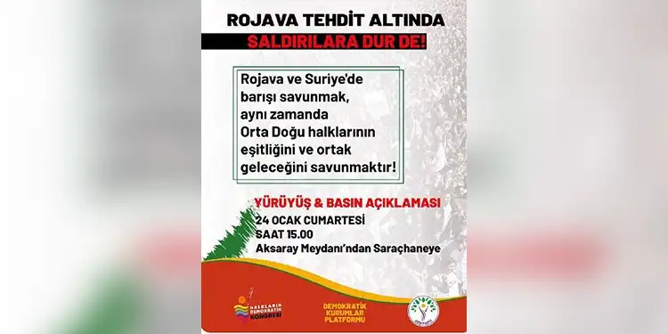 HTŞ, DAİŞ ve Türkiye destekli grupların Rojava’ya yönelik saldırıları devam ederken,  ülkenin dört bir yanında da Rojava’ya saldırılar protesto edilmeye devam ediyor. Demokratik Kurumlar Platformu, Halkların Demokratik Kongresi (HDK) Halkların Eşitlik ve Demokrasi Partisi (DEM Parti), HTŞ, DAİŞ ve Türkiye destekli paramiliter grupların Rojava’ya yönelik saldırılarını protesto etmek ve barışı savunmak amacıyla İstanbul’da yürüyüş gerçekleştirecek.