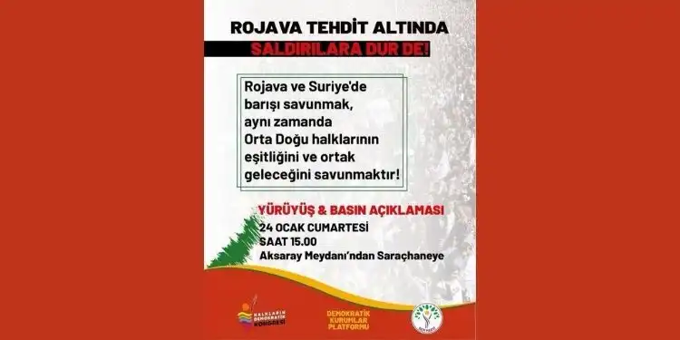 DSG’nin yenilgiye uğrattığı DAİŞ’lileri bünyesine katan HTŞ ve Türkiye’nin desteklediği paramiliter grupların Rojava’ya yönelik soykırım ve katliamlarına karşı Kürdistan başta olmak üzere tüm dünya da yaşayan Kürtler ve dostları protesto ve eylemlerine devam ediyor. Halkların Eşitlik ve Demokrasi Partisi(DEM Parti), Demokratik Bölgeler Partisi(DBP) ve Halkların Demokratik Kongresi’nin (HDK) öncülüğünde 24 Ocak Cumartesi günü, 15.00’da Aksaray Meydanı’ndaki yürüyüşle Rojava direnişine destek vermek için tüm yurttaşlara yarın toplanma çağrısı yapıldı.