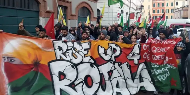 Ararat, Kurdistan Enformasyon Bürosu, La Sapienza Üniversitesi gençliği, Rete Kürdistan ve Riseup4Rojava’nın çağrısıyla Piazza Vittorio Emanuele’de başlayan yürüyüşe çok sayıda STÖ, COBAS sendikalar konfederasyonu ve anarşist federasyon katıldı.