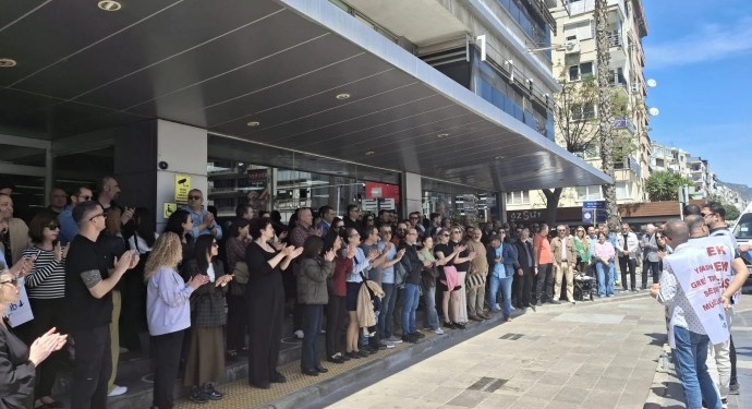 Bayraklı ve Karşıyaka belediyelerinde çalışan kamu emekçileri, TİS görüşmelerinin tıkanması üzerine belediye önünde yaptıkları eylemde, ‘Kazanılmış haklarımızı elimizden almaya kalkmasınlar’ dedi