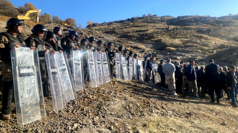 Jandarma iş makinalarını korumak için köylülerin önüne barikat kurdu. Karşı çıkanları coplarla e tekmelerle darp eden jandarmaya köylüler, “Ne yapacaksınız öldürecek misiniz” diye tepki gösterdi.