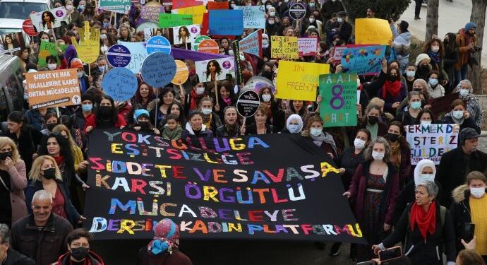 Ellerinde “Kadın tutsaklara özgürlük”, “Kadın kadının yurdudur”, “Emeğin gaspına karşı örgütlüyüz”, “Erkek egemenliğine karşı ayaktayız”, “Cezasızlık politikalarına karşı ortak mücadeleye” yazılı dövizler bulunan kadınlar, yine cezaevinde tutuklu bulunan Kürt siyasetçi Aysel Tuğluk ile milletvekilliği düşürülen HDP’li Semra Güzel’in fotoğraflarını taşıdı. Seyit Rıza Meydanı’na ulaşan kadınlar, burada çalınan davul ve zurna eşliğinde halay çekerek 8 Mart’ı kutladı.