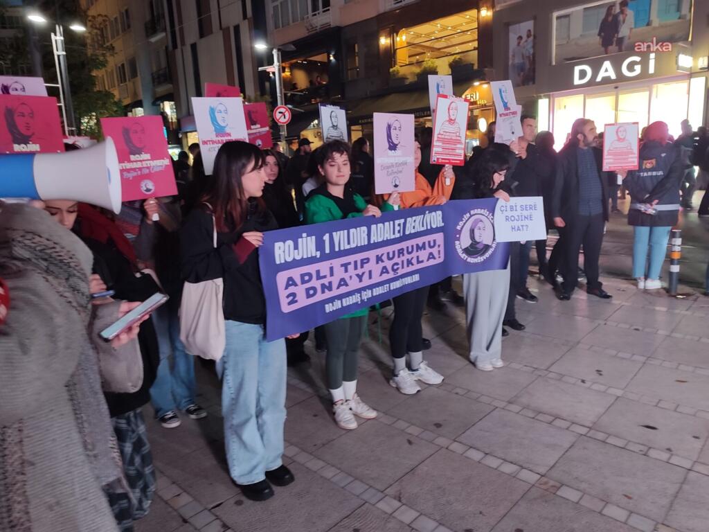 “Rojin 1 yıldır adalet bekliyor. Adli Tıp Kurumu, 2 DNA’yı açıkla” yazılı pankart açan eylemciler, “Rojin intihar etmedi” yazılı dövizler taşıdı ve  “Rojin için adalet” ve “Erkek adalet değil, gerçek adalet” sloganları attı.