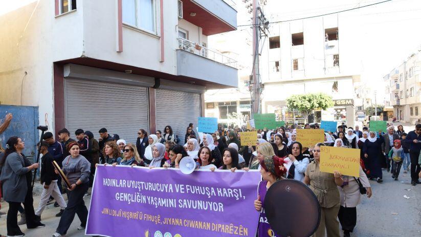 Kitle ardından “Genç kadınlar uyuşturucuya geçit vermez”, “Uyuşturucuya değil yaşama sahip çık” ve “Yaşama sarıl, uyuşturucuya dur de” dövizleri taşıyarak yürüyüşe geçti. “Kadınlar uyuşturucuya ve fuhuşa karşı gençliğin yaşamını savunuyor” pankartının taşındığı yürüyüşte, “Uyuşturucuya karşı omuz omuza, “Fuhuşa karşı omuz omuza, “Be Serok jiyan nabe, “Susma haykır, uyuşturucuya hayır ve “Biji Serok Apo” sloganları ile DEM Parti Akdeniz ilçe binası önüne doğru yürüdü. Burada basın açıklaması gerçekleştirildi.