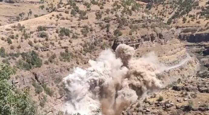 Mezopotamya Ajansı’na ulaşan görüntülerde; Karayolları 9. Bölge Müdürlüğü’nün yol çalışmalarında yer alan bir kişinin “Patlatma alandan uzak şekilde gerçekleştirilecek” uyarısının ardından patlama gerçekleştiriliyor ve dağlık alan patlamayla birlikte sarsılıyor. Sonrasında çalışanların kahkahaları yükseliyor. Bir kişinin “Yerle bir ettik” sözü de görüntüleri yansıyor.