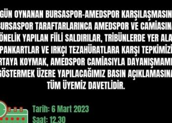 Diyarbakır Kent Koruma ve Dayanışma Platformu, Bursa’da Amedspor’a yönelik ırkçı saldırıya karşı Amed Spor Tesisleri’nde yapılacak açıklamaya katılım çağrısında bulundu...
