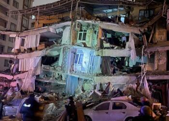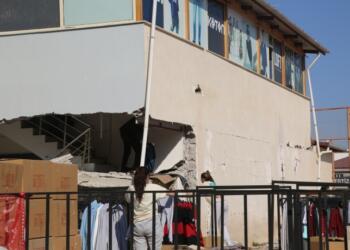 İslahiye’de işçiler depremde hasar alan ve yıkılma tehlikesi altında olan giyim mağazasında çalışıyor Mereş merkezli depremlerden etkilenen Dîlok’a bağlı İslahiye...