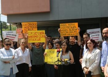 İş bırakma eylemlerinin 9’uncu gününde KRT emekçilerine, DİSK Basın-İş, ÇGD ve DEM Parti'nin aralarında olduğu gazeteci ve meslek örgütü temsilcileri...
