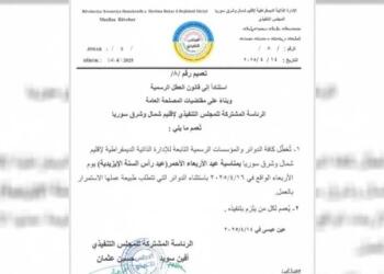 Tümünü GörDetailsKuzey ve Doğu Suriye Demokratik Özerk Yönetimi, Çarşema Sor Bayramı’nda resmi kurumlarda tatil olacağını açıkladı Kuzey ve Doğu Suriye Demokratik...