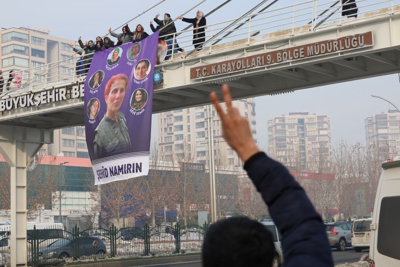 Özgür Kadın Hareketi (Tevgera Jinên Azad -TJA), 9 Ocak 2013’te Paris’te katledilen Kürt kadın siyasetçiler Sakine Cansız, Fidan Doğan ve Leyla Şaylemez, 23 Aralık 2023’te Paris’te katledilen Evîn Goyi ve 5 Ocak 2015’te sokağa çıkma yasakları sırasında katledilen Pakize Nayır, Sevê Demir, Fatma Uyar’ın fotoğraflarının bir üst geçide astı. TJA’lı kadınlar, “Şehid namirin” yazılan fotoğrafları, Amed’in Rezan (Bağlar) ilçesinde bulunan Kadın Doğum Devlet Hastanesi önündeki üst geçide astı. “Jin jiyan azadî” sloganı ve zılgıtlarla fotoğrafları asan kadınlara, çevredekiler, alkış, ıslık çalıp zafer işaretleriyle destek verdi.