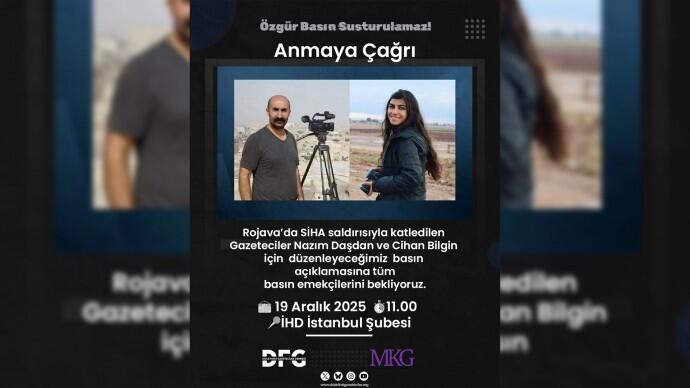 Kuzey ve Doğu Suriye bulunan Tişrîn Barajı’ndaki gelişmeleri takip ederken Türkiye’nin SİHA saldırısıyla doğrudan hedef alarak katlettiği gazeteciler Nazım Daştan ile Cihan Bilgin ölüm yıl dönümlerinde İstanbul’da anılacak. Dicle Fırat Gazeteciler Derneği (DFG) ve Mezopotamya Kadın Gazeteciler Derneği (MKG), İnsan Hakları Derneği İstanbul Şubesi’nde 19 Aralık’ta basın toplantısı düzenleyecek. Toplantı, “Özgür basın susturulamaz” şiarıyla saat 11.00’de yapılacak.