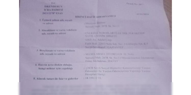 Hatay’ın İskenderun ilçesinde 6 Şubat’ta dini nikahlı olduğu köy korucusu Turgay Kaya tarafından iki çocuğuyla katledilen 7 aylık hamile Selma Abacı’nın elektrik borcu nedeniyle annesinin evine haciz gönderildi. İskenderun İcra Dairesi tarafından EnerjiSA Enerji’nin 18 bin 359 TL borcuna karşılık anne Müzeyyen Bütüner’in evine haciz ihbarnamesi gönderildi.