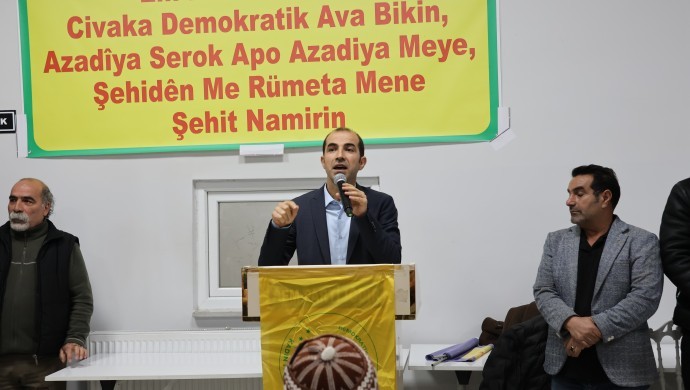 Programın düzenlendiği salona, “Hakikatin izinde, güneşin sofrasında buluşma şiarıyla demokratik toplumu inşa ediyoruz”, “Em bi nirxên xwe Civaka Demokratîk ava bikin” yazıları asılırken, programa Demokratik Bölgeler Partisi (DBP) Eş Genel Başkanı Keskin Bayındır, Halkların Eşitlik ve Demokrasi partisi (DEM Parti) Îdir Milletvekili Yılmaz Hun, Wan milletvekili Mahmut Dindar ve Îdir demokratik kitle örgütlerinin yanısıra çok sayıda kişi katıldı. Program, saygı duruşunun ardından konuşmalarla başladı.