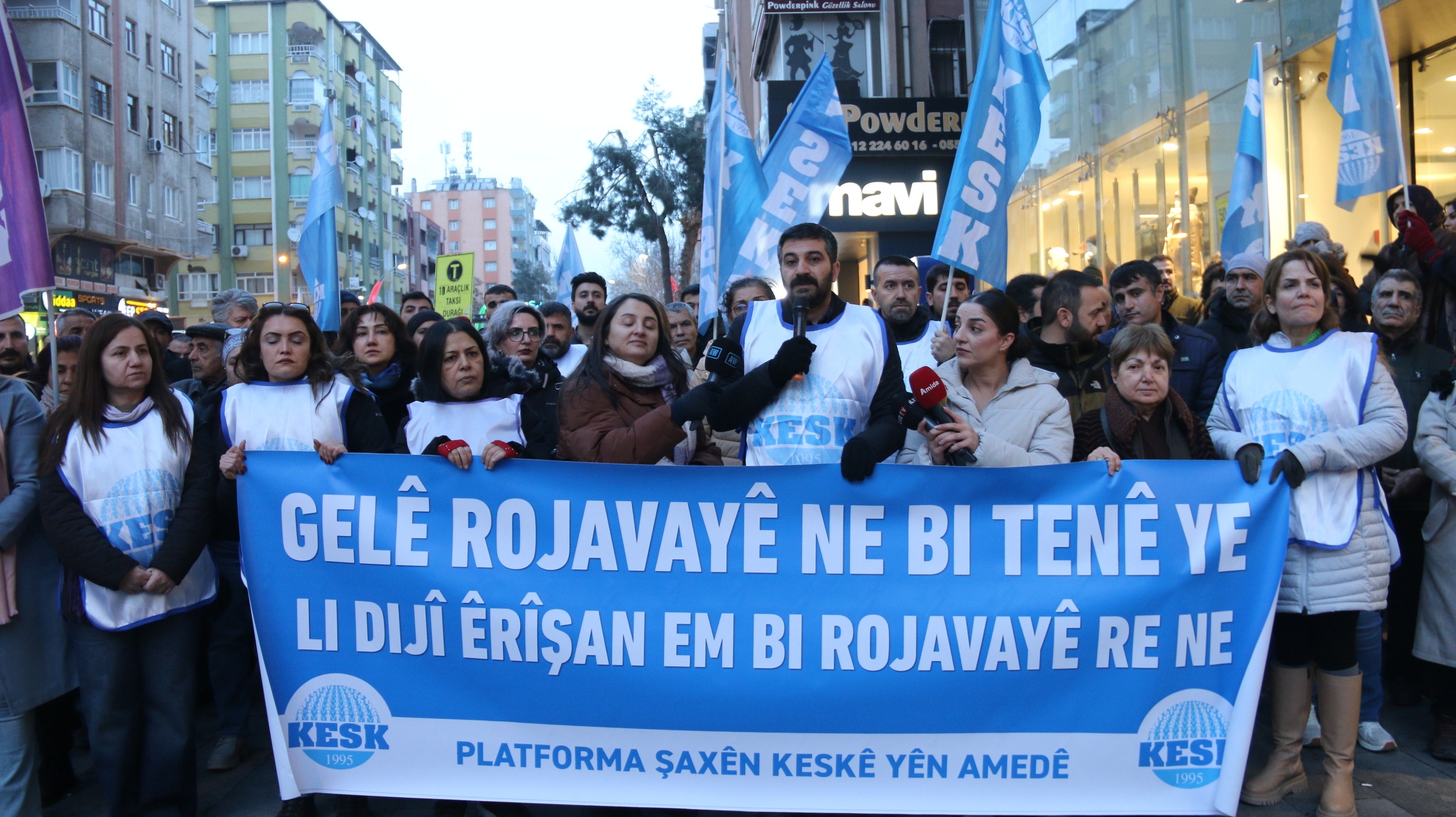 Kamu Emekçileri Sendikaları Konfederasyonu (KESK) Amed Şubeler Platformu, “Rojava halkının yanındayız” şiarıyla, Yenişehir ilçesine bağlı Ofis Semti’nde bulunan AZC Plaza önünde açıklama yaptı. Açıklamada “Gelê Rojava ne bi tenê ye, li dıjî erîşan em bi Rojava re ne” pankartı açıldı. Açıklamada sık sık “Bijî berxwedana Rojava”, ”Katil HTŞ Rojavadan defol” ve “Bijî berxwedana gelê Kurd” sloganları atıldı. Burada konuşan Eğitim ve Bilim Emekçileri Sendikası (Eğitim Sen) Amed 2 No’lu Şube Eşbaşkanı Duygu Özbay, Kürt halkının yüzyıllardır inkar, imha ve asimilasyon politikalarının hedefi olduğunu vurguladı.