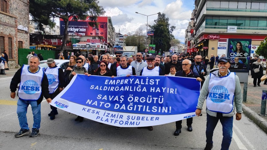 Kamu Emekçileri Sendikaları Konfederasyonu (KESK) İzmir Şubeler Platformu, NATO’nun 77’nci kuruluş yıl dönümünde “NATO üsleri kapatılsın” talebiyle Şirinyer’deki NATO yerleşkesi önünde açıklama yaptı. “Emperyalist saldırganlığa hayır! Savaş örgütü NATO dağılsın” pankartı taşınan açıklamada “NATO’ya hayır” ve “Emperyalistler, iş birlikçiler 6’ıncı filoyu unutmayın” dövizleri taşınırken sık sık “Katil Amerika Ortadoğu’dan defol” sloganları atıldı. Açıklamaya çok siyasi parti temsilcisi katıldı.