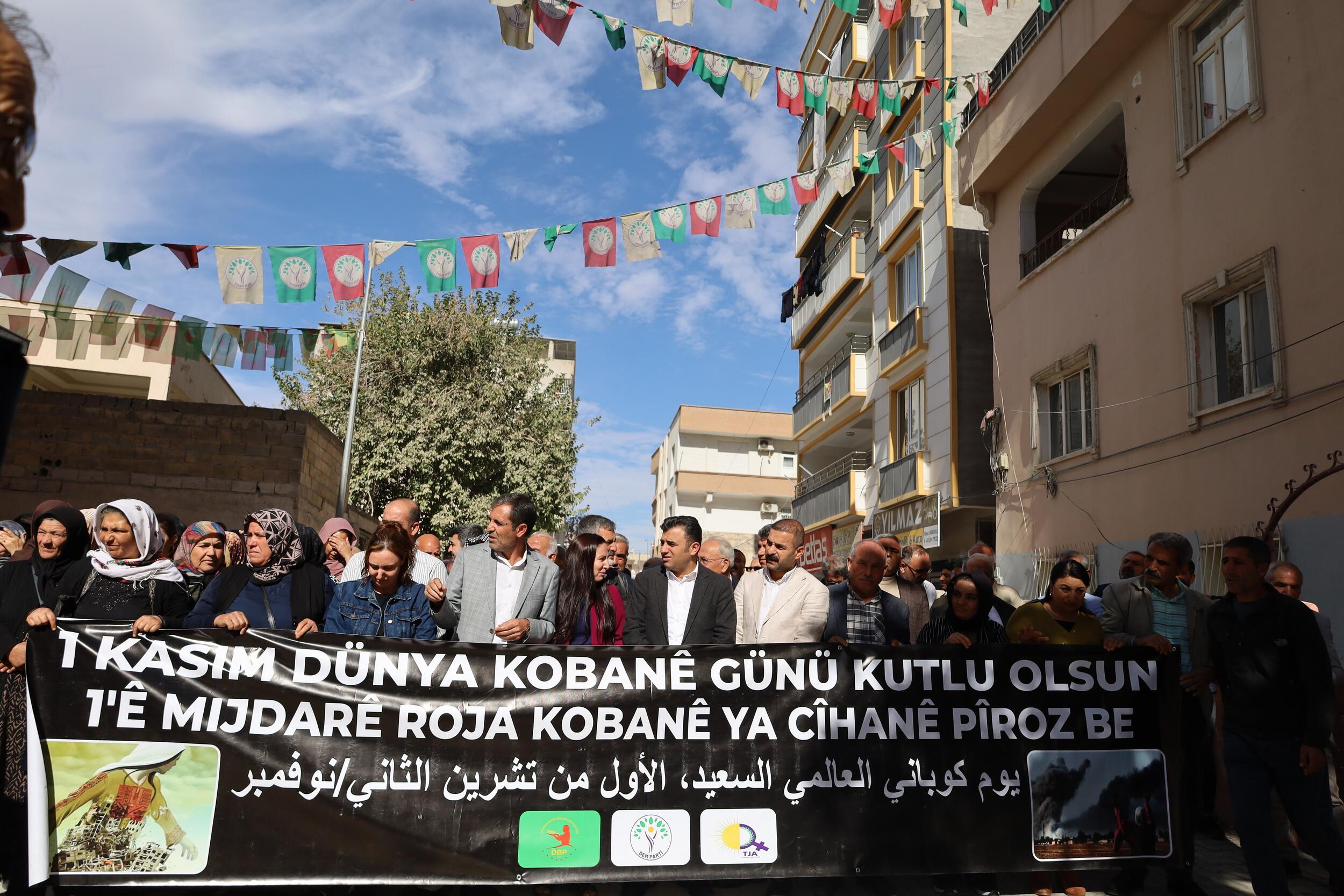Amed’de 1 Kasım Dünya Kobanê Günü dolayısıyla Rêzan (Bağlar) ilçesi Dörtyol Kavşağı’nda bir araya gelen Demokratik Kurumla Platform üyeleri açıklama yaptı. “1’ê Mijdarê roja cîhanê ya Kobanê pîroz be” pankartının açıldığı açıklamada, “Bijî berxwedana Kobanê, “Jin jiyan azadî”, “Bijî Serok Apo”, ve “Bê serok jiyan nabe” sloganları atıldı. Metnin Kürtçe’sini DBP Amed İl Eşbaşkanı Ruçem Elyakut, Türkçesini ise DEM Parti Amed İl Eşbaşkanı Abbas Şahin okudu.