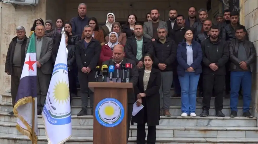 Kuzey ve Doğu Suriye’nin Kobanê kenti Özerk Yönetimi, Suriye geçici hükümeti tarafından Çelebiye ilçesine belediye başkanı atamasına karşı halkın düzenlediği protestolar ve geçici hükümet güçlerinin protestoculara yönelik saldırıları hakkında bir açıklama yaptı. Açıklama, Kobanê Özerk Yönetimi binası önünde Kongra Star Kobanê kenti Koordinasyonu üyesi Peyman Elûş tarafından yapıldı.