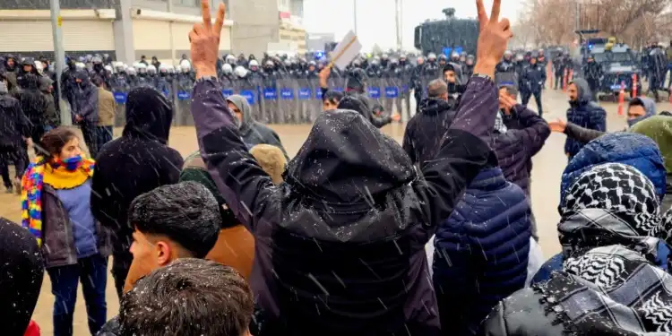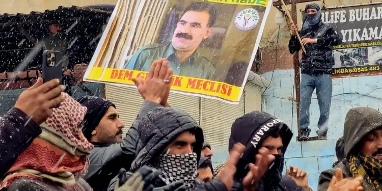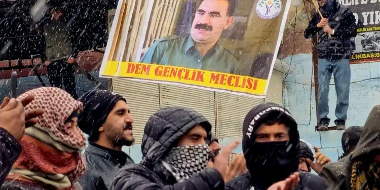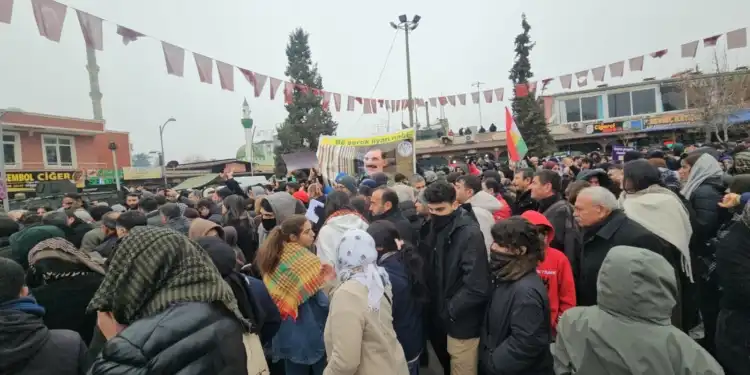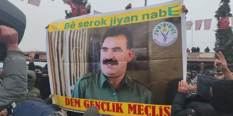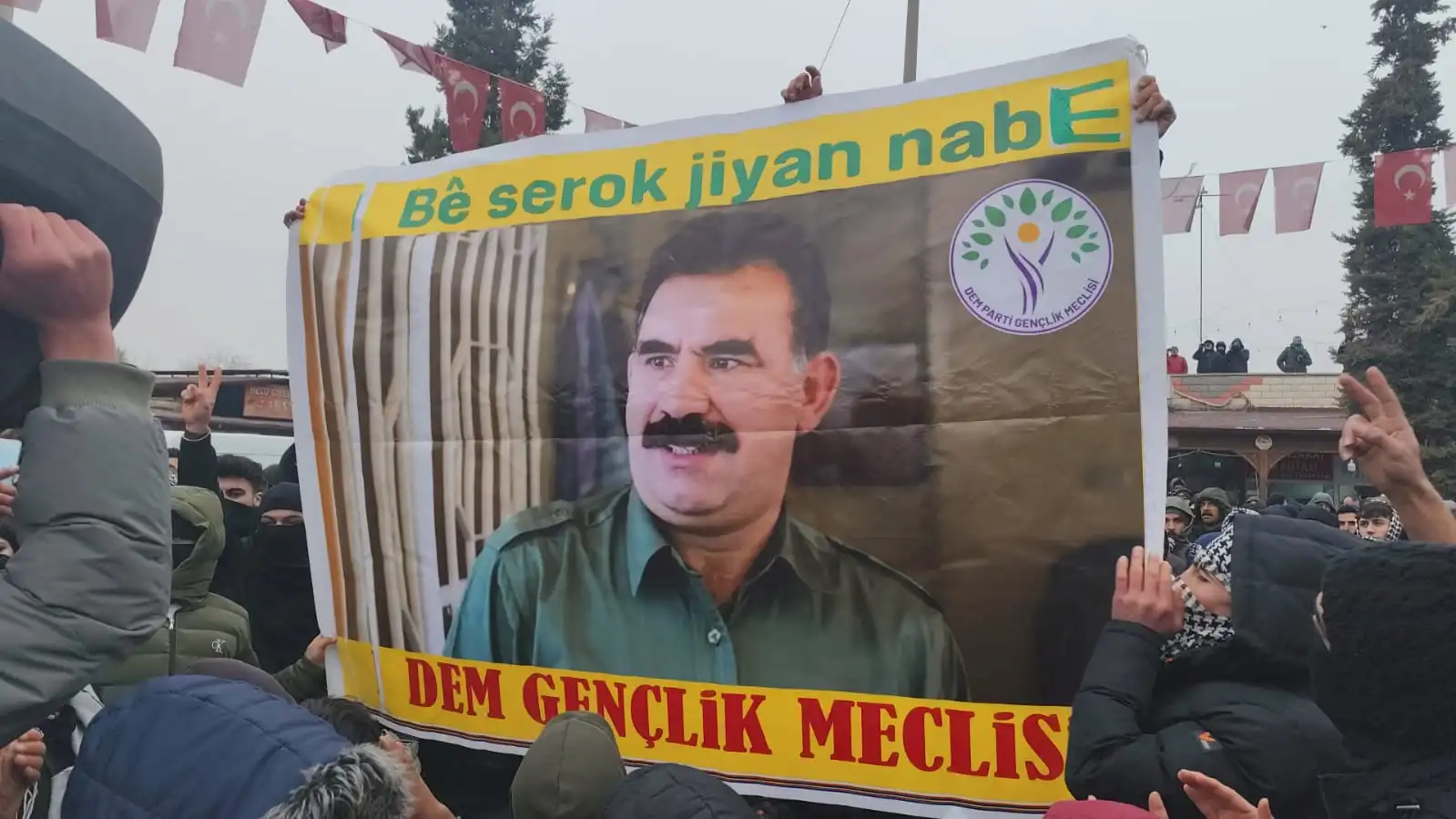 Kobanê sınırına yürümek için bir araya gelen gençler, Kürt Halk Önderi Abdullah Öcalan’ın posterini açtı.