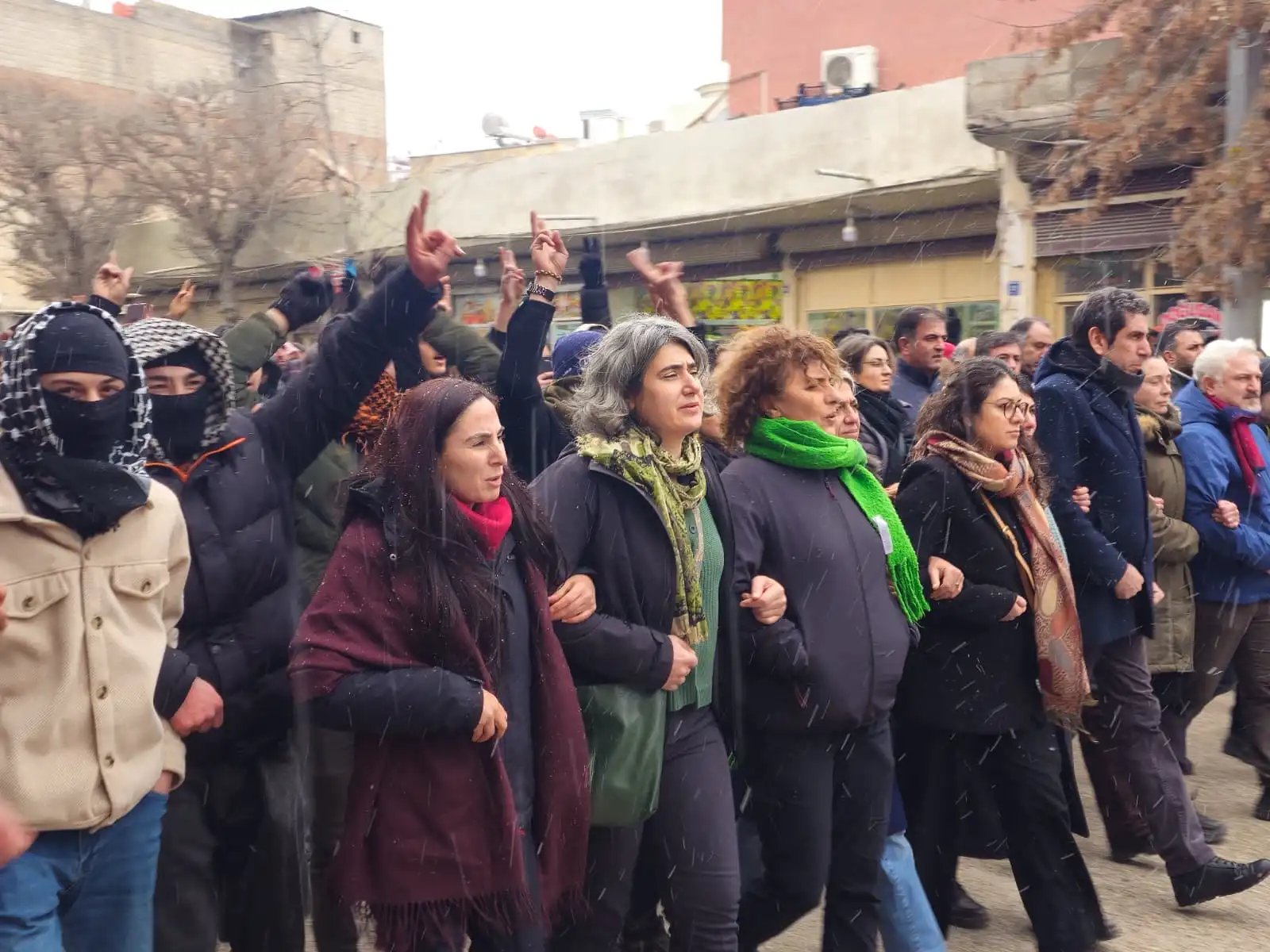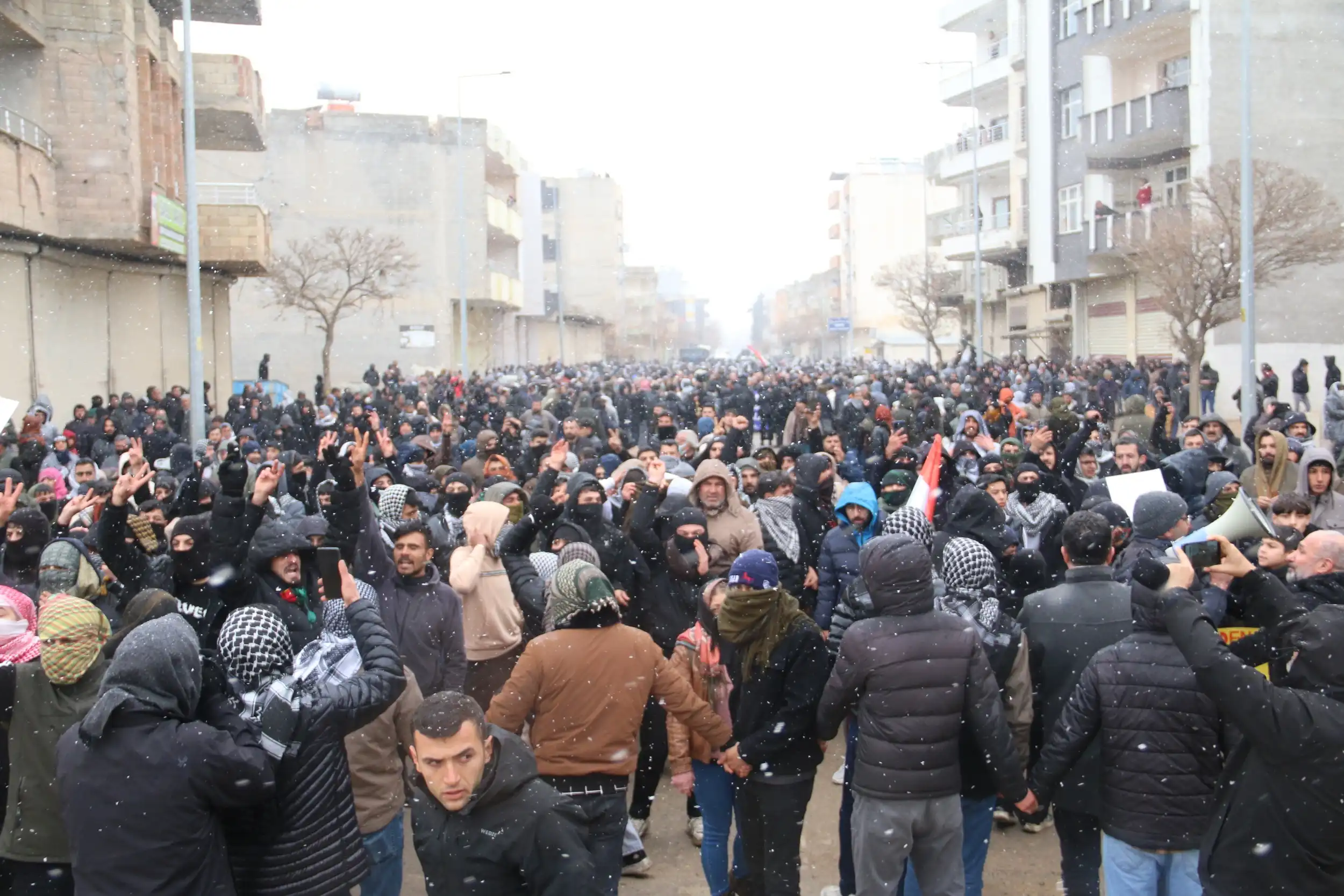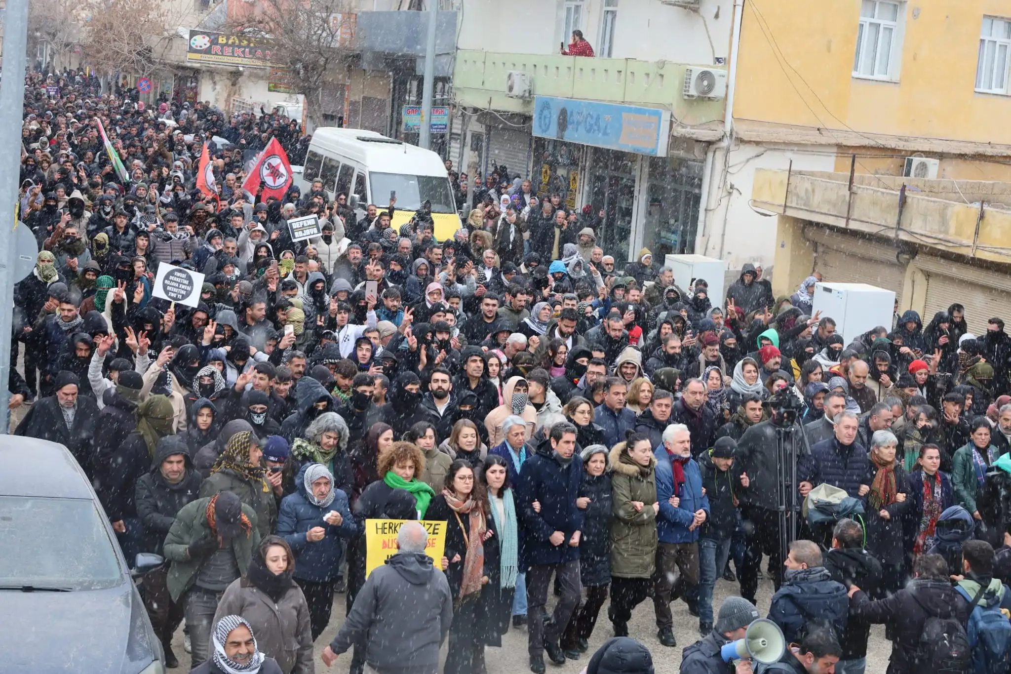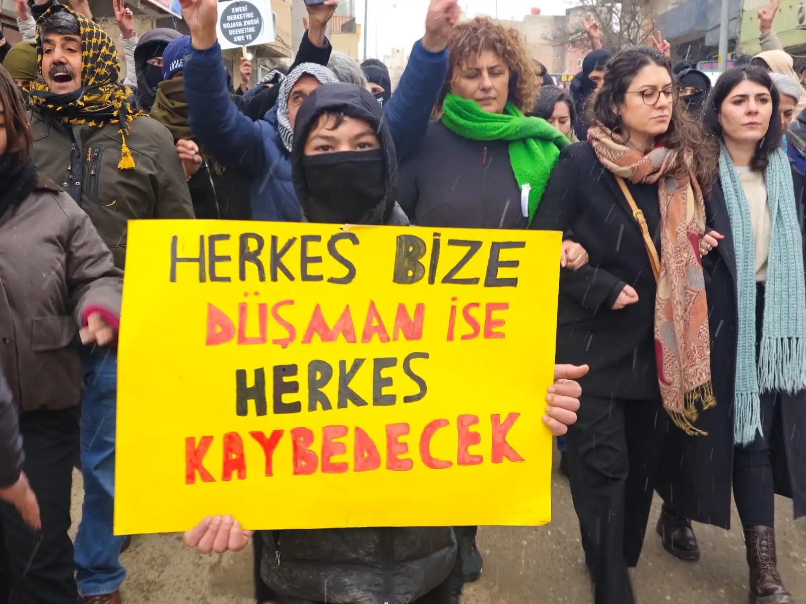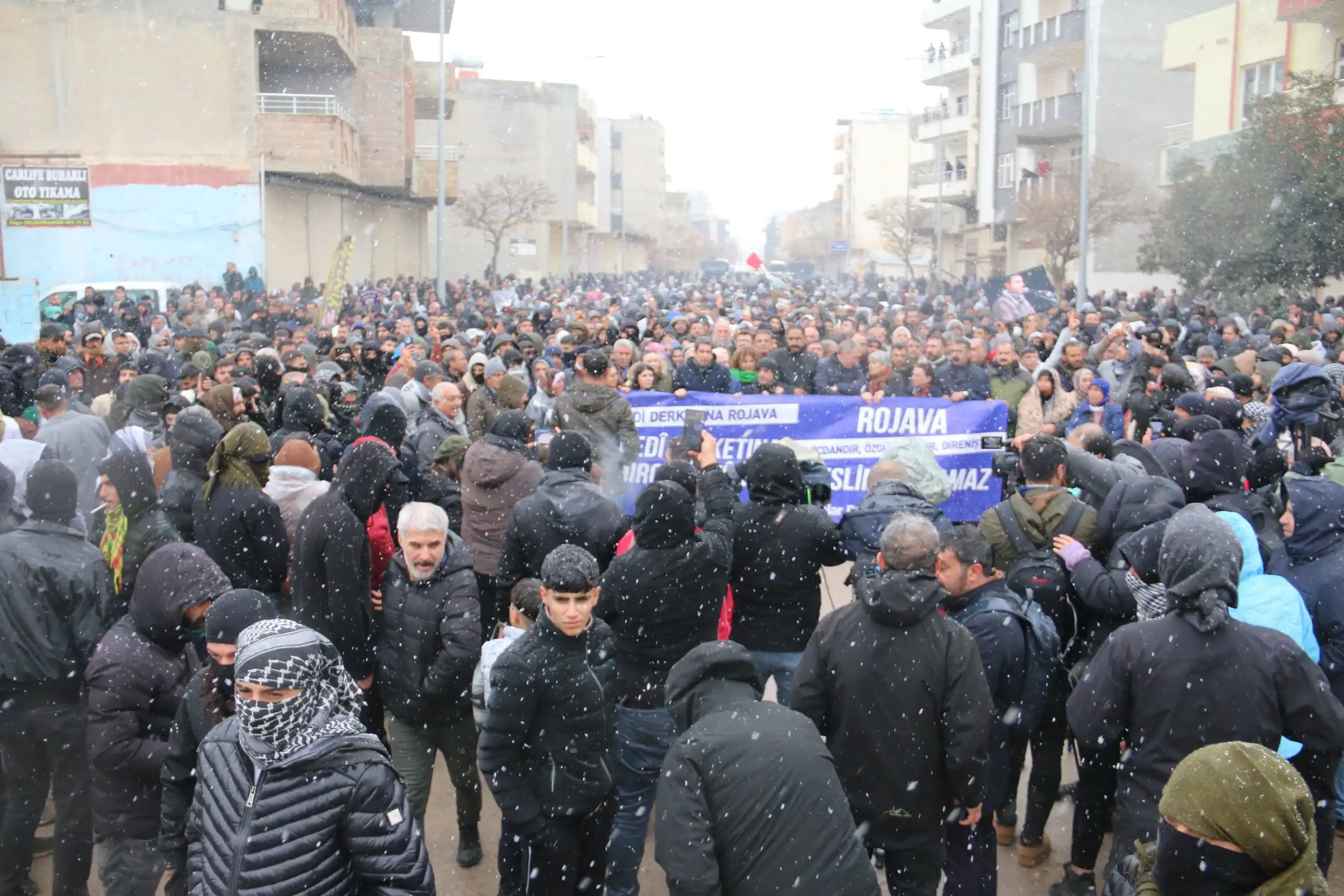 Yürüyüşe geçen halk Şex Meqsûd ve Eşrefiye’de katledilen savaşçıların fotoğraflarını taşırken, sık sık “Bijî berxwedana Rojava”, “Bijî serok Apo”, “Şehid Namirin” ve “Jin jiyan azadî” sloganları atıyor.