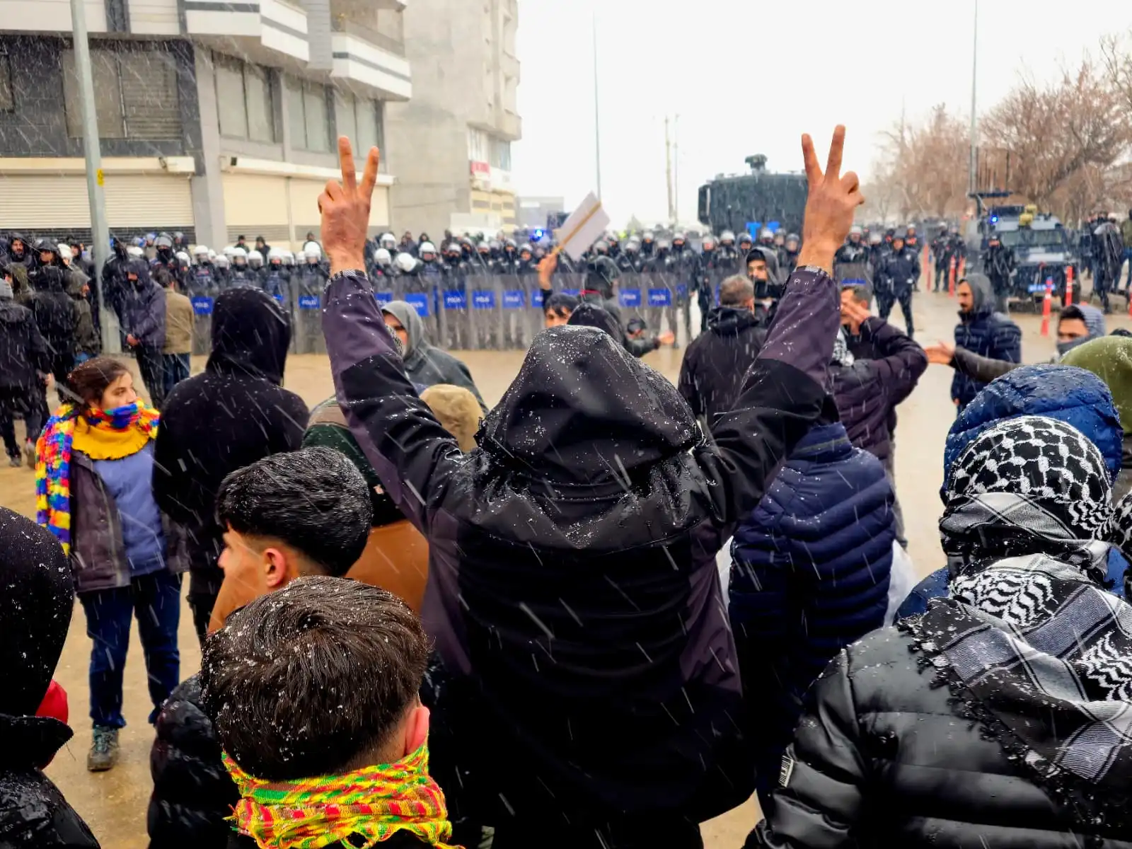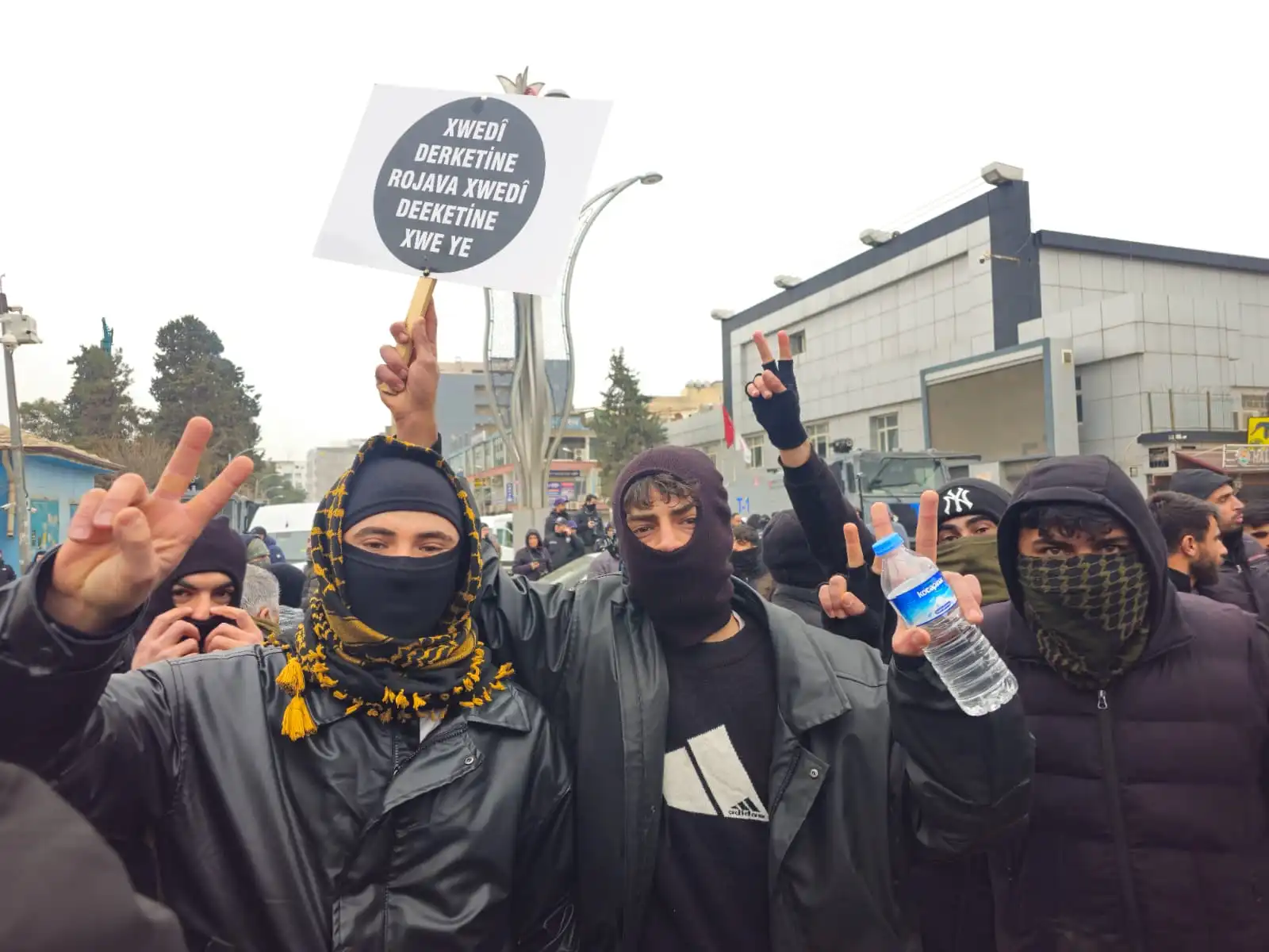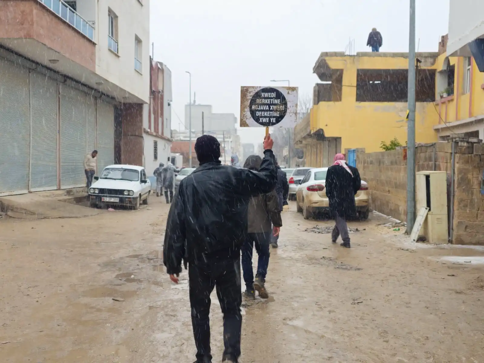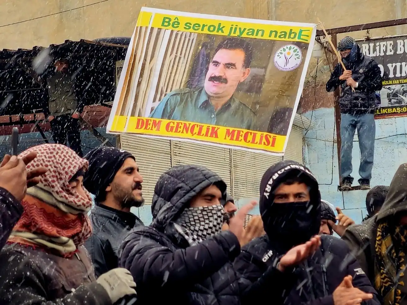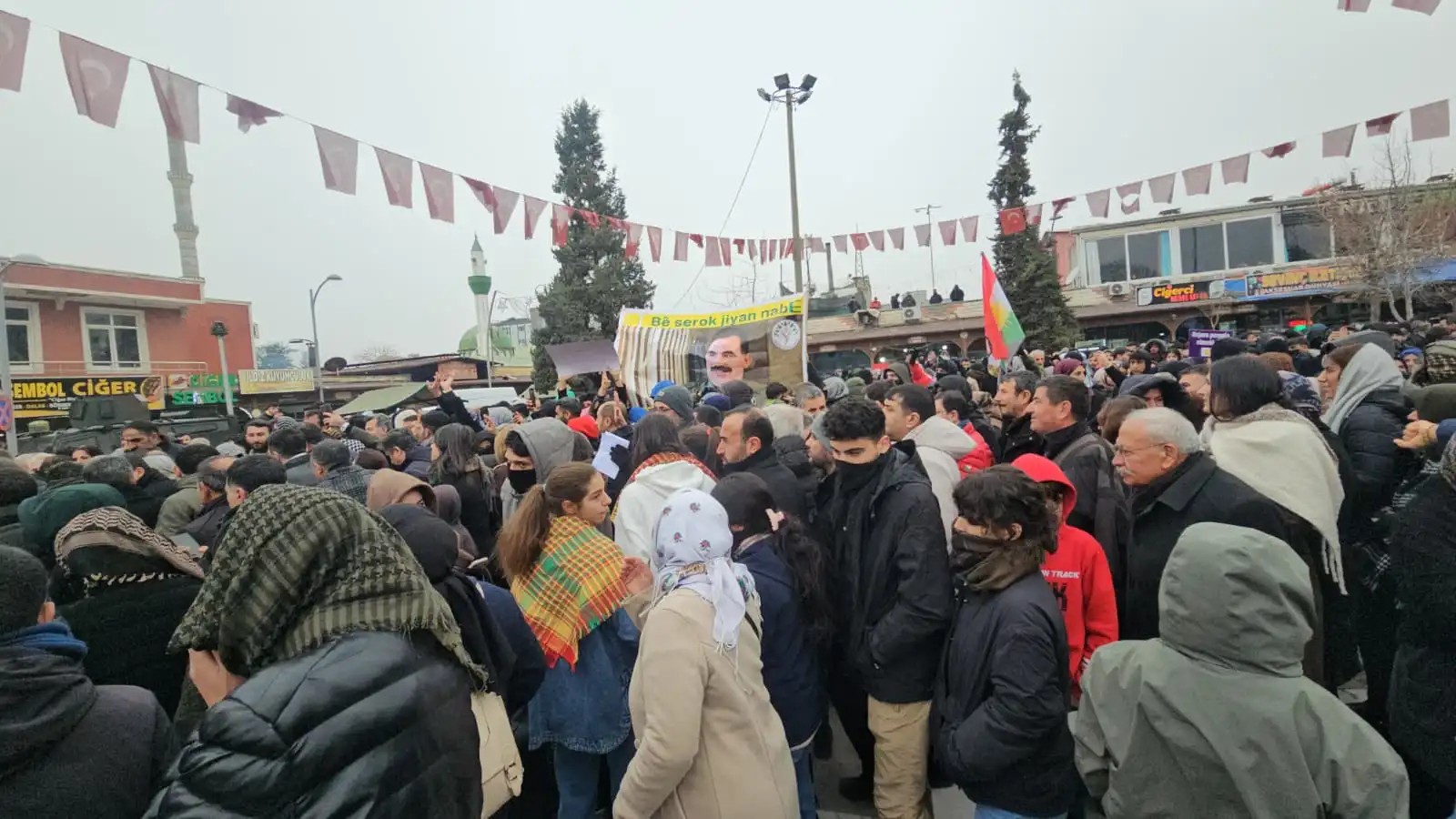 Kobanê sınırına yürümek için bir araya gelen gençler, Kürt Halk Önderi Abdullah Öcalan’ın posterini açtı.