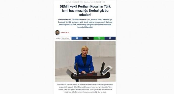 Sabah gazetesinde bugün yayınlanan haberde, Milletvekili Perihan Koca’nın annesini tedavi ettirmek için İzmir’deki özel bir hastaneye gittiği, ancak annesiyle ilgilenen hemşirenin eski bir Türk ismine sahip olduğu için odadan kovduğu ileri sürüldü.