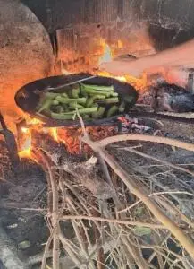 Evin ihtiyacı olan, biber, havuç, patlıcan, domates, bamya hasadına geldi sıra. Toplanan tazeler yıkandı. Renk, renk, tat, tat kimyasalsız, ilaç kalıntısız, besin bakımından zengin tazeleri pişirmek ve közlemek için kuru dallar ocağa yerleştirildi. Dal parçalarıyla ocak tutuşturuldu. Bacada duman tüttü. Ocaktaki odun alev aldı. Kahvaltılıklar ateşte közlendi, pişirildi. Alın teri ve yoğun emek ve bilgelikle üretilmiş ürünlerden hazırlanmış kahvaltıya oturuldu.