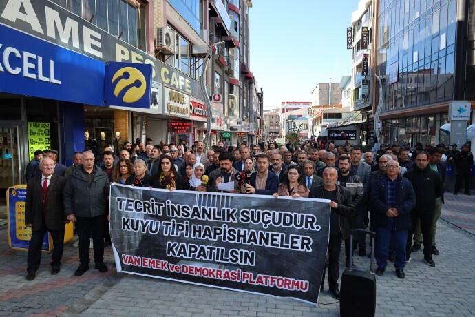 Açıklamaya platform bileşenlerinin yanı sıra çok sayıda yurttaş katıldı. Basın metnini okuyan İnsan Hakları Derneği (İHD) Wan Şube Eşbaşkanı Mehmet Salih Coşkun, “2005 yılından itibaren her yıl belirgin artışlarla seyreden kapatılma pratikleri, tecridin değişik boyutlarının uygulanmasına cevaz verecek tasarımlarla ihlallerin de derinleşmesine yol açmıştır. Yeni hapishaneler arasında özellikle 2021 yılından itibaren de ‘S Tipi Ceza İnfaz Kurumu’, ‘Y Tipi Ceza İnfaz Kurumu’ ve ‘Yüksek Güvenlikli Ceza İnfaz Kurumu’ adları altında, bilindiği kadarı ile son verilere göre Y tipi 22 hapishane, yüksek güvenlikli 22 hapishane ve S tipi 7 hapishane olmak üzere toplam 51 yeni tip hapishane kullanıma açılmıştır” dedi.