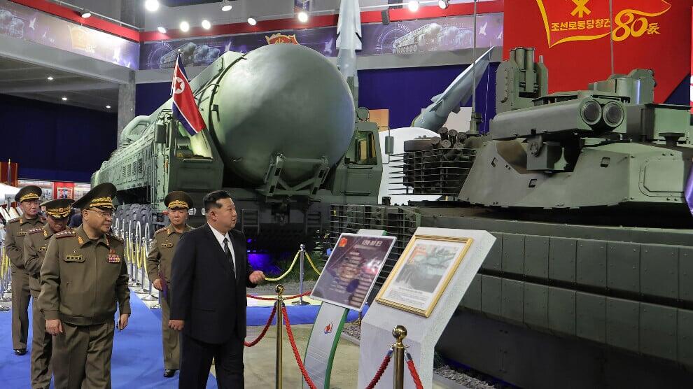 KCNA tarafından yayımlanan fotoğraflarda Kim Jong-un’un, füzelerin de sergilendiği bir silah fuarında generallerle birlikte yürüdüğü görüldü.