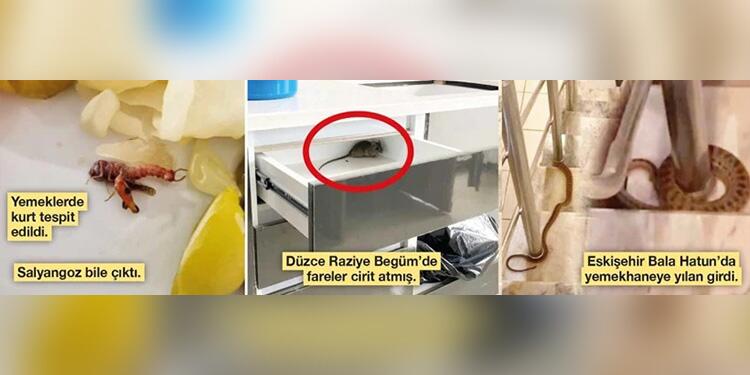 - Düzce Raziye Begüm yemekhanesinde fare, Eskişehir Bala Hatun yemekhanesinde yılan bulundu; Kütahya Hezar Dinari’de ekmeklerin arasında fare görüldü.